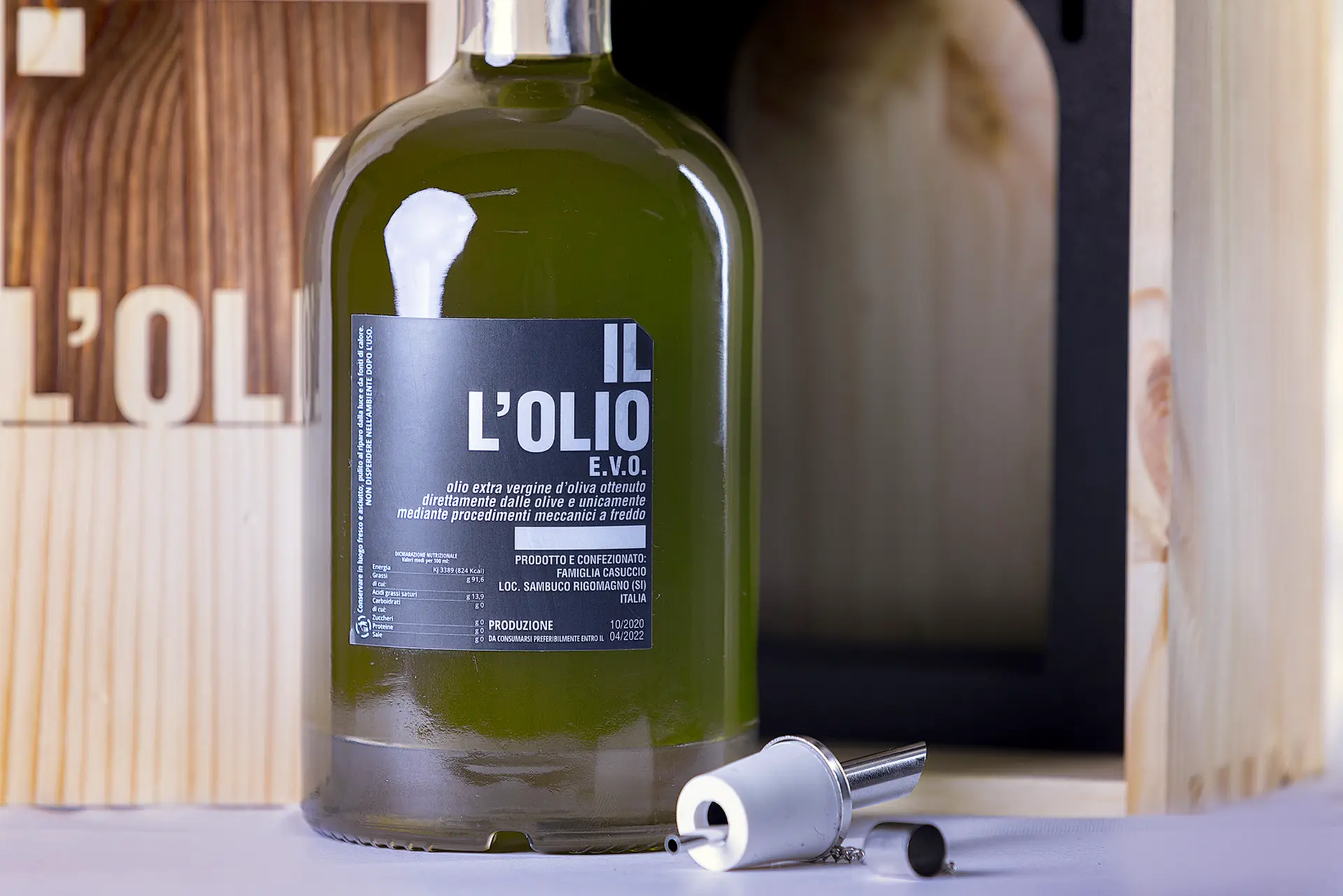 Olio Extra Vergine di Oliva ottenuto da sole Olive Italiane e di proprietà della Famiglia Casuccio provenienti da una sola uliveta di circa 1000 piante secolari sita sulla sommità della collina di Rigomagno, nel comune di Sinalunga, e mediante procedimento di spremitura a freddo. Olio con un gusto rotondo ma deciso, ed una nota di acido derivante dalla spremitura anticipata per mantenere il colore vivo e la viscosità alta. IL L'OLIO viene consegnato in una bottiglietta da 50cl, tappata a raso come il vino per preservarne al massimo le caratteristiche. La bottiglietta è contenuta in una splendida cassetta di legno personalizzata ed accompagnata da un versatore con catenella da applicare dopo aver stappato la bottiglia. Tutte le bottiglie sono numerate a mano: disponibile in sole 100 unità.