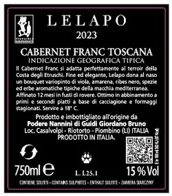 Il Cabernet Franc si adatta perfettamente al terroir della Costa degli Etruschi esprimendo una ricchezza di profumi e aromi impossibili da ottenere altrove. Fine ed elegante, Lelapo, vinificato in serbatoi di cemento e affinato 12 mesi in fusti di rovere, dona al naso un bouquet variopinto di viola, amarena, ribes nero, liquirizia, tabacco, spezie ed erbe aromatiche tipiche della macchia mediterranea. Ottimo in abbinamento a primi e secondi piatti a base di cacciagione e formaggi stagionati. Vitigni: Cabernet Franc 100% Servire a 18° c